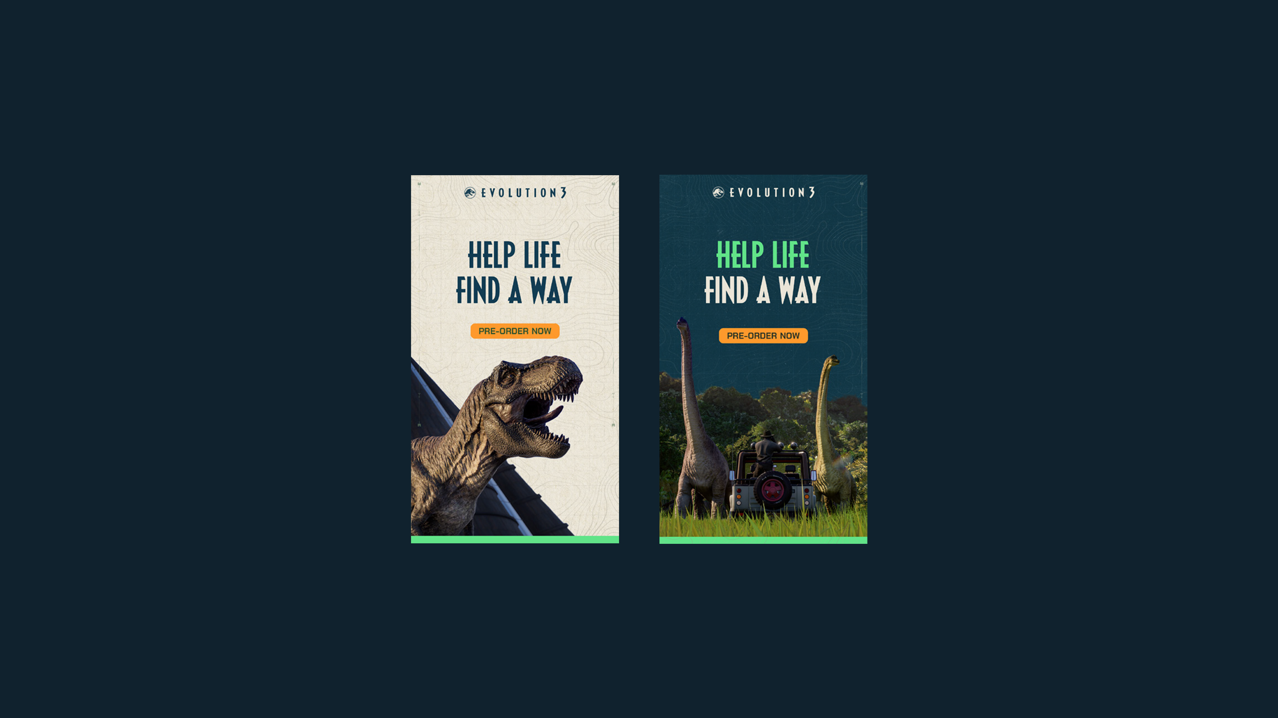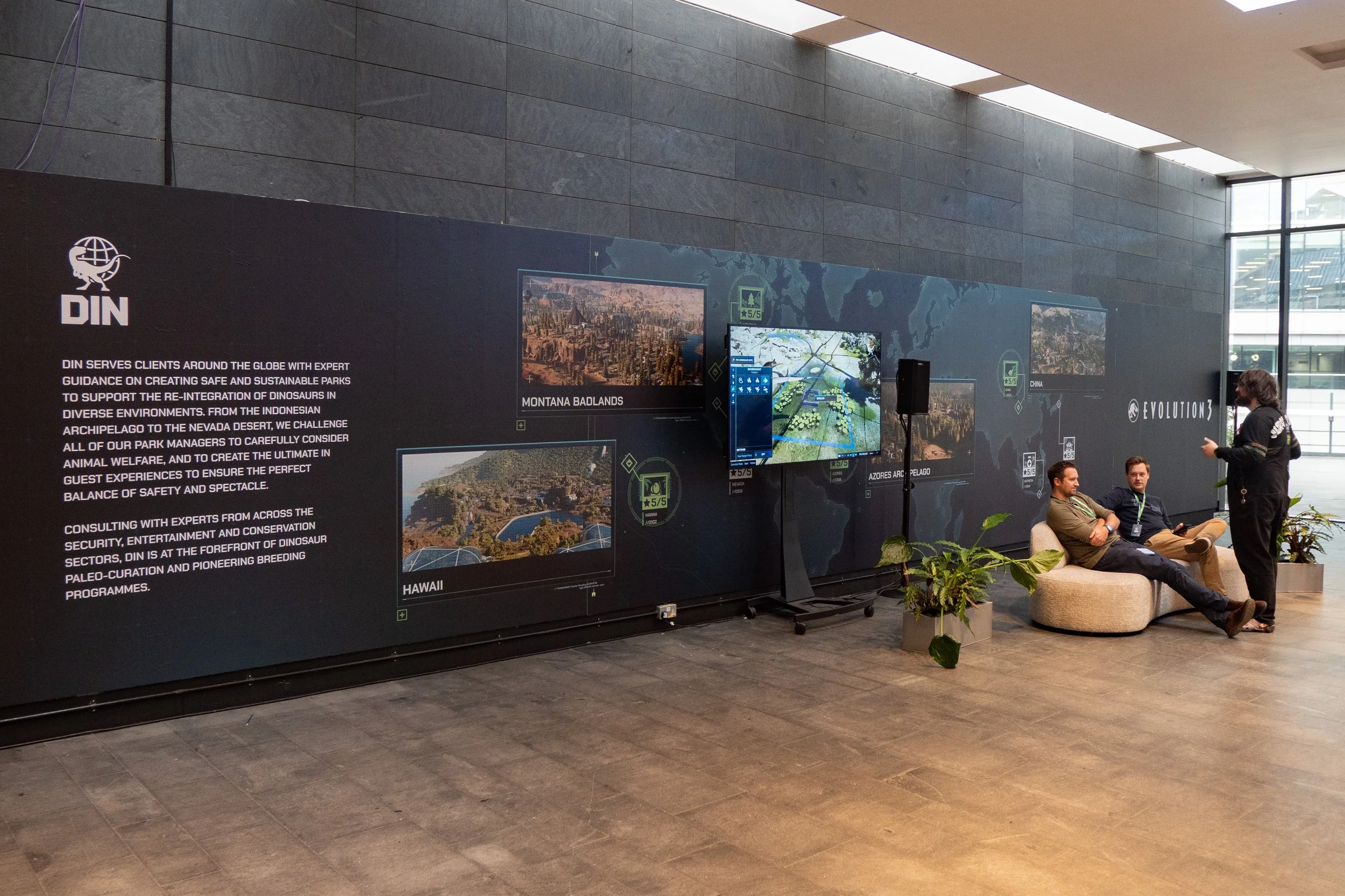 I also produced the branding for the in-game fictional organization DIN (Dinosaur Integration Network), whose mission is to support coexistence between humans and dinosaurs. In JWE3, players assume the role of Park Manager working on behalf of DIN.